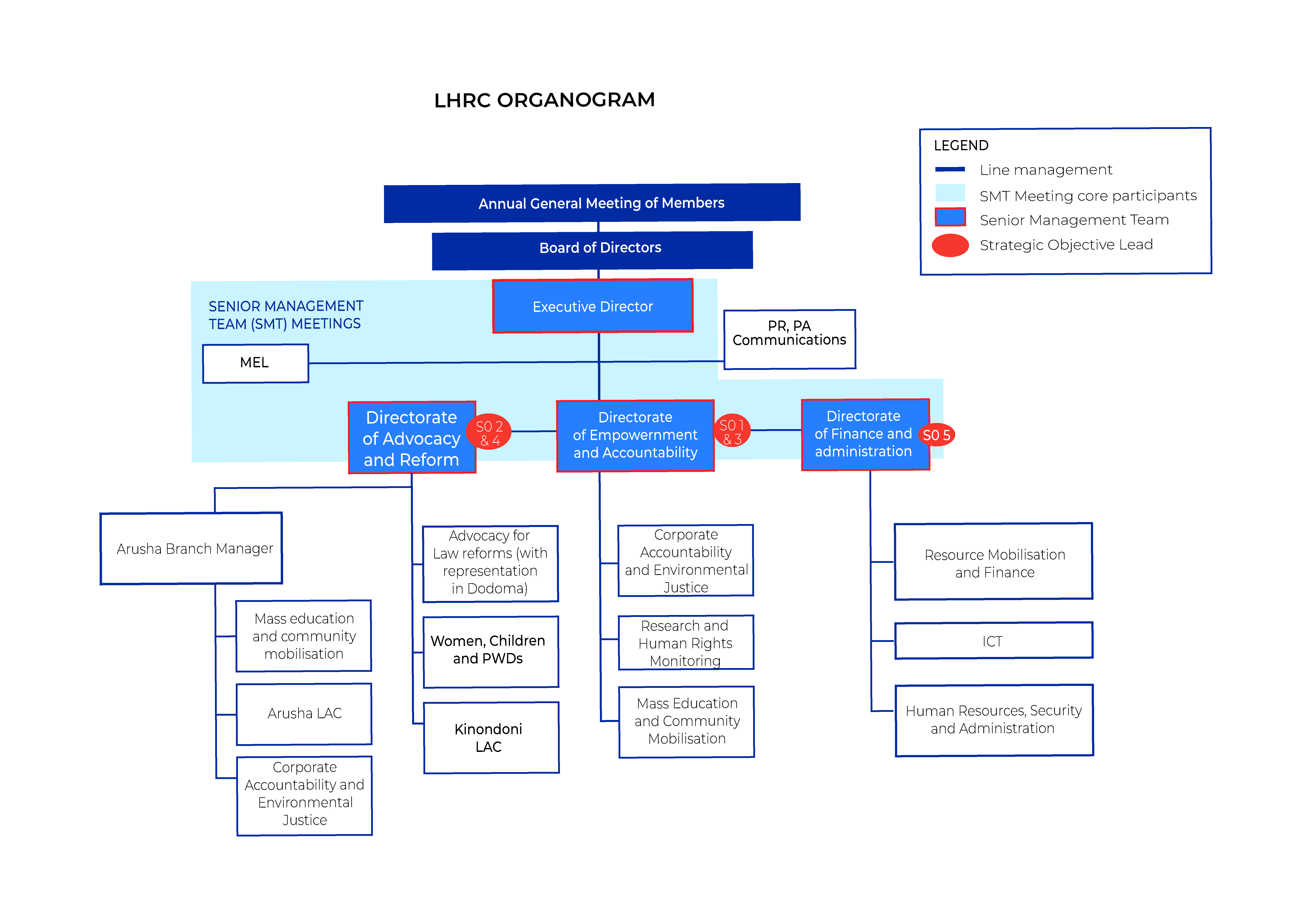 LHRC is a membership organization with current membership base of more than 130 members. The organization is governed by the Annual General Meeting (AGM) which meets each year. AGM appoints Board of Directors and approve the external auditors. It also receives the audited accounts reports of the organization. LHRC has a Board of Directors (BoD). Currently there are 8 board members with different backgrounds; lawyers, human rights experts, religious leader, journalist, and accountants. The BoD is the supreme governance body. LHRC has a management team which is headed by the Executive Director.