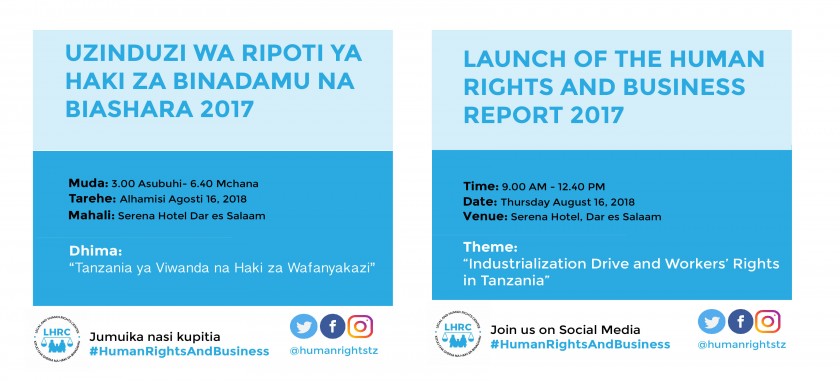 LHRC has been preparing an annual report on the situation human rights and business in Tanzania since 2012. On Thursady August 16, 2018 LHRC will launch its sixth human rights and business report, assessing corporate compliance with labour laws and standards, corporate responsibility to respect human rights, state duty to protect human rights and remedy for violation of human rights in the business sector in Tanzania Mainland for the year 2017.